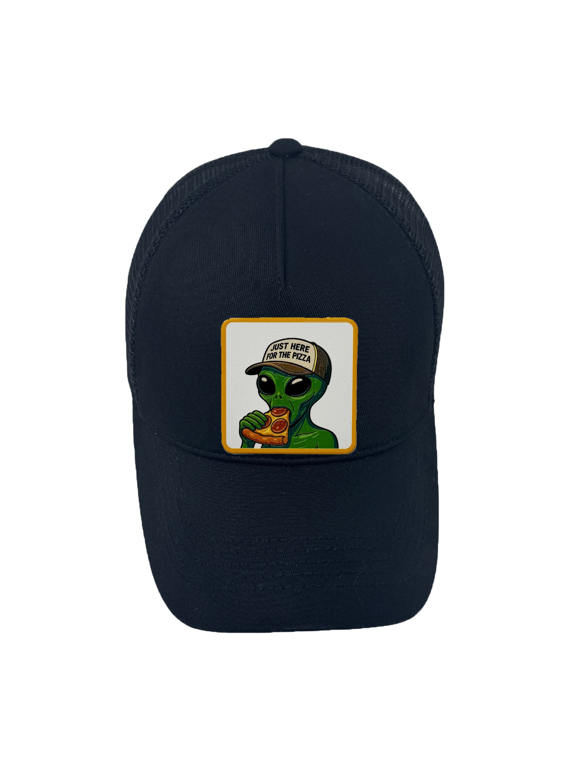Here for the Pizza | Embossed Removable Patch Trucker Hat – Adjustable Snapback, Breathable Mesh, One Size Fits Most