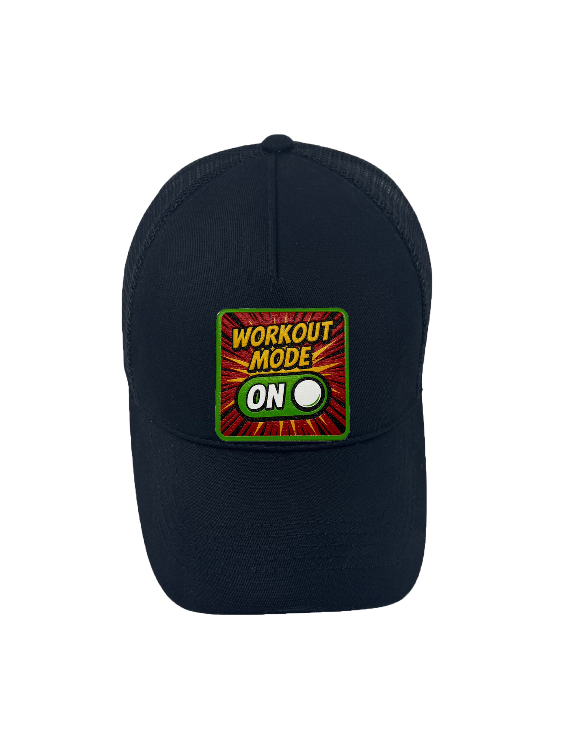 Workout Mode On | Embossed Removable Fitness Patch Trucker Hat – Adjustable Snapback, Breathable Mesh, One Size Fits Most